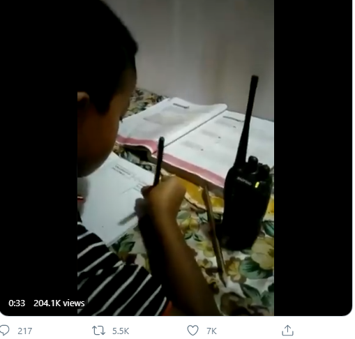 Dalam video itu terlihat seorang anak laki-laki sedang menulis di atas meja sambil mendengarkan suara sang guru dari HT di dekatnya. Ia meletakkan HT di sebelah kanannya, bersebelahan dengan buku yang sedang ia tulis.