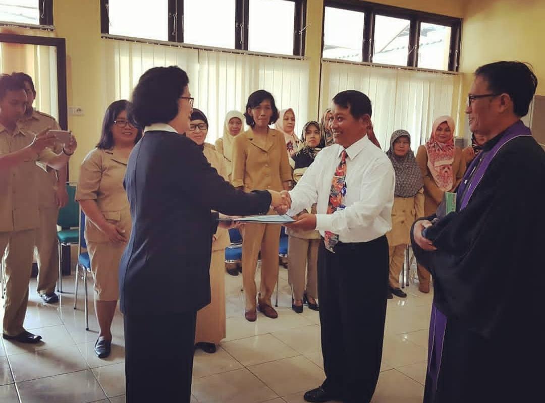 Pelantikan Pustakawan Ahli Utama Sukeri, S.Pd, M.Mis oleh Kepala Dinas Perpustakaan dan Kearsipan Kab. Sleman IR. A.A. Ayu Laksmidewi T.P. , M.M., di Ruang Rapat Bidang Perpustakaan, Senin (11/3), Foto: IG @Pperpusarsipsleman