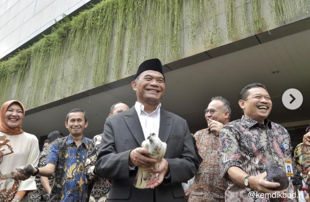 Menteri Pendidikan dan Kebudayaan Muhadjir Effendy melepas burung merpati, menandai dibukanya rangkaian peringatan #Hardiknas2019 di Kantor Kemendikbud, Jakarta, Jumat (26/4/2019). Sumber: @kemdikbud.ri/Instagram