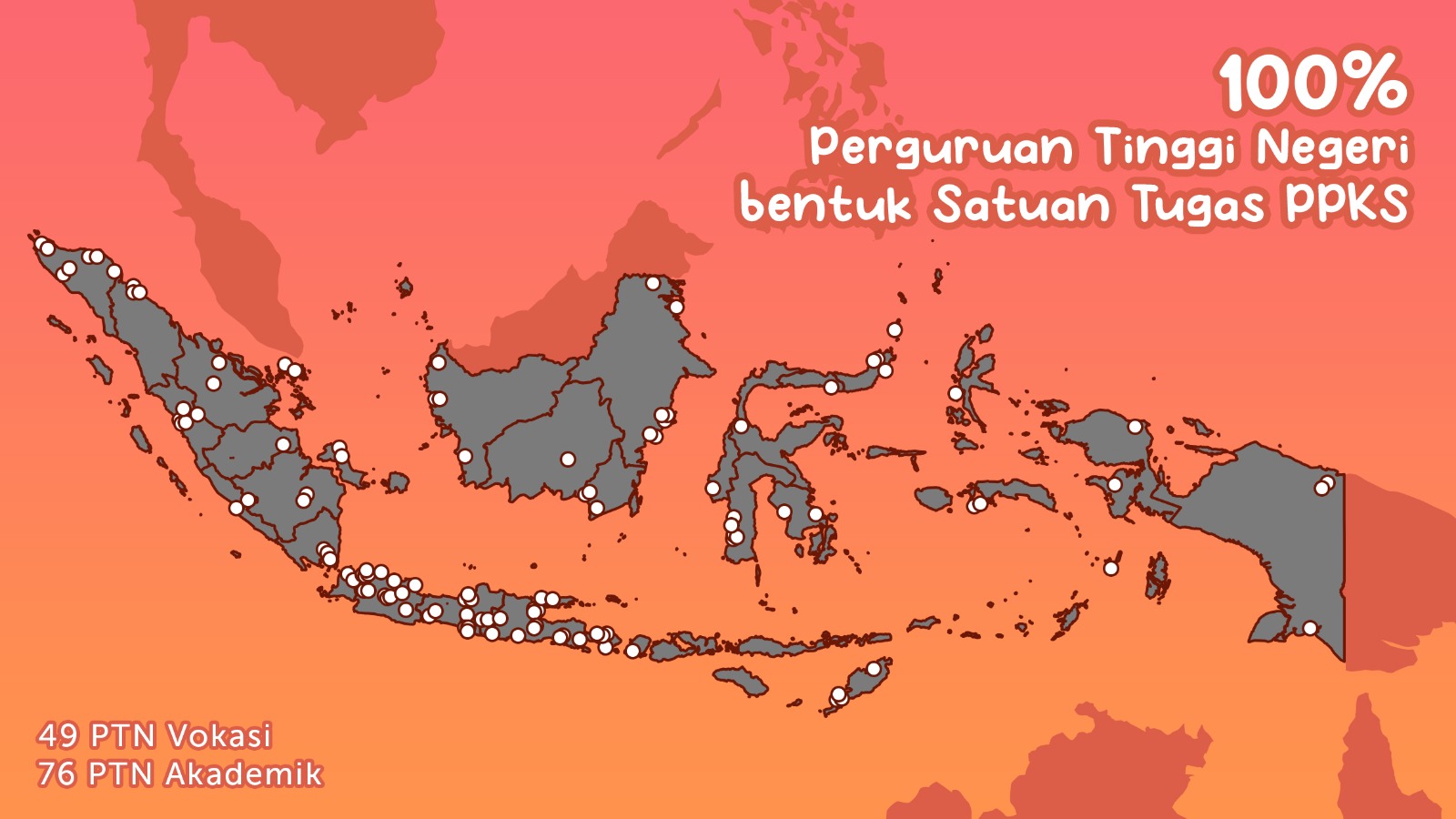 Kepala Pusat Penguatan Karakter (Puspeka) Kemendikbudristek Rusprita Putri Utami menyampaikan, saat ini keseluruhan dari 125 Perguruan Tinggi Negeri (PTN) di Indonesia yang terdiri dari 76 PTN Akademik dan 49 PTN Vokasi telah membentuk Satgas PPKS.