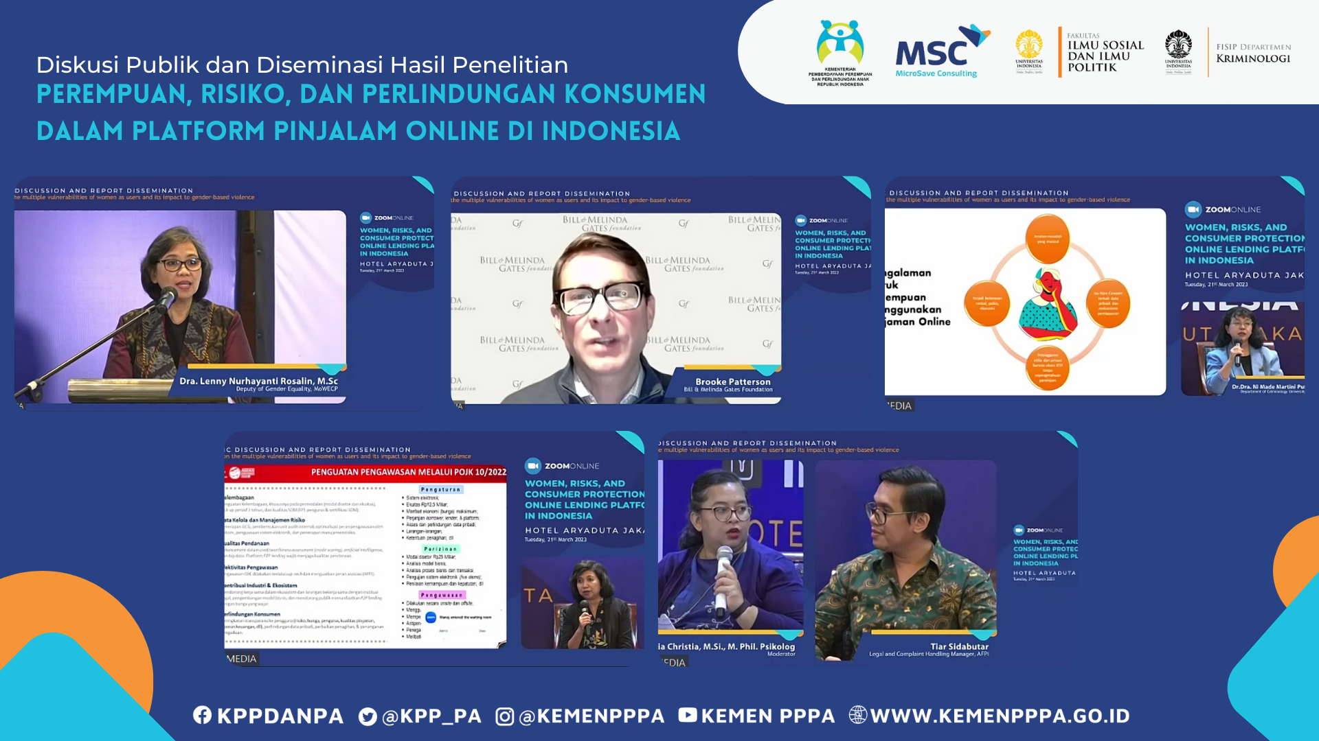 Guna mendapatkan gambaran lebih jauh, Kementerian Pemberdayaan Perempuan dan Perlindungan Anak (KemenPPPA) bersama Departemen Kriminologi Universitas Indonesia dan MicroSave Consulting (MSC) menyelenggarakan Diskusi Publik dan Diseminasi Hasil Penelitian ‘Perempuan, Risiko, dan Perlindungan Konsumen pada Platform Pinjaman Online di Indonesia’.