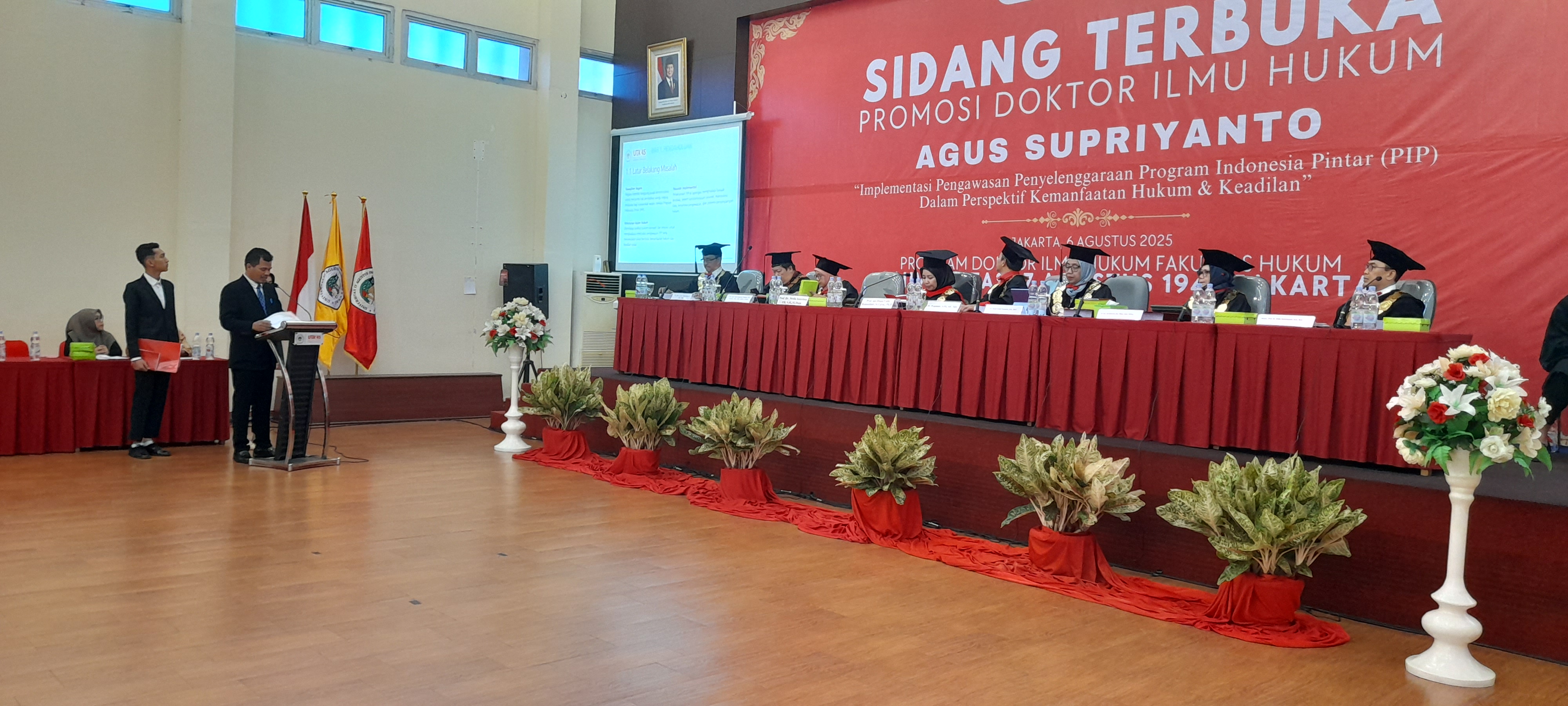 SCHOOLMEDIA JAKARTA == Fakultas Hukum Universitas 17 Agustus 1945 (UNTAG) Jakarta kembali mencatat sejarah akademik melalui Sidang Promosi Doktor Agus Supriyanto pada Selasa, 5 Agustus 2025 yang meneliti secara mendalam pelaksanaan Program Indonesia Pintar (PIP) yang menjadi program prioritas Pemerintah mantan presiden Joko Widodo.