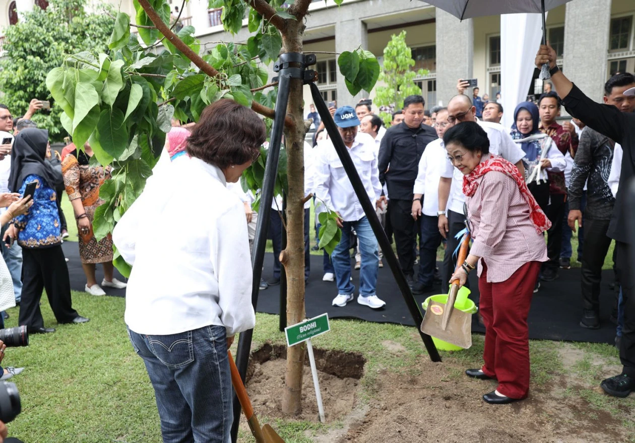Presiden Kelima RI, Megawati Soekarnoputri sekaligus Ketua Dewan Pengarah Badan Riset dan Inovasi Nasional (BRIN) RI bersama dengan Rektor Universitas Gadjah Mada, Prof. dr. Ova Emilia, M.Med.Ed., Sp.OG(K)., Ph.D, menanam pohon Bodhi (Ficus religiosa) di halaman depan Gedung Pusat UGM, Rabu (1/10). Penanaman pohon ini sebagai bentuk upaya mendukung upaya konservasi dan pelestarian keanekaragaman hayati.