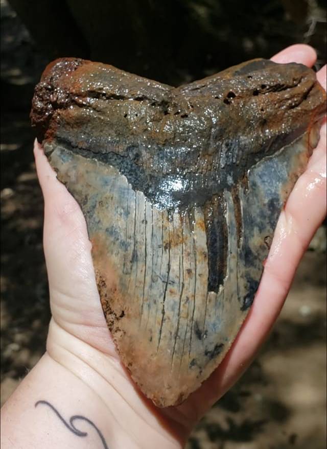 Schoolmedia News, Amerika Serikat - Seorang wanita di South Carolina, AS, menemukan gigi hiu megalodon raksasa saat sedang berjalan di pinggir sungai. Wanita bernama Jessica Rose-Standafer Owens ini awalnya melihat potongan besar gigi berwarna abu-abu yang mencuat dari pasir di pinggir Sungai Stono, South Carolina.