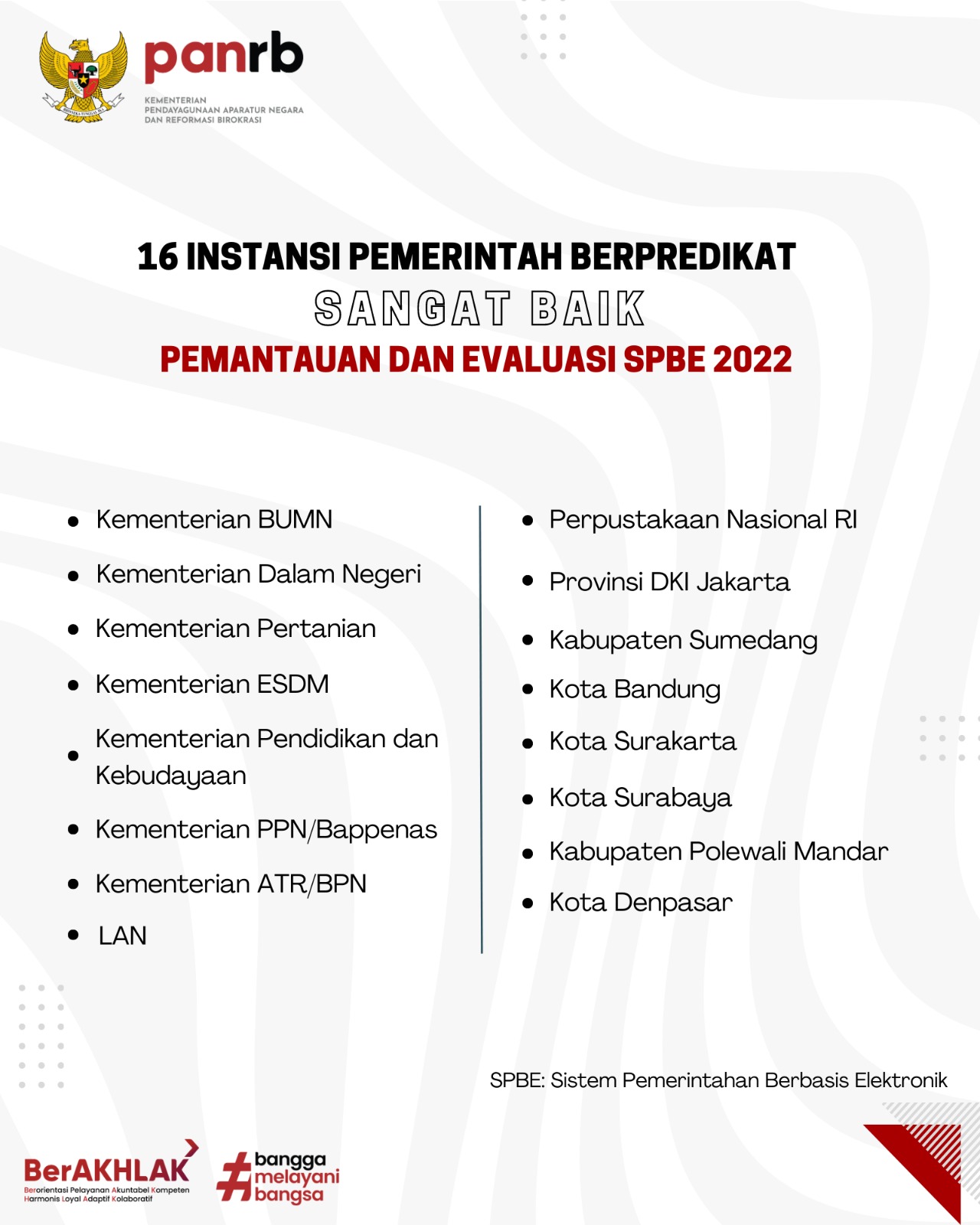 Ke-16 IPPD peraih predikat ‘Sangat Baik’ pada tauval SPBE tahun 2022 adalah Kementerian Badan Usaha Milik Negara (BUMN); Kementerian Dalam Negeri; Kementerian Pertanian; Kementerian Energi dan Sumber Daya Mineral (ESDM); Kementerian Pendidikan dan Kebudayaan; Kementerian Perencanaan Pembangunan Nasional (PPN)/Badan Perencanaan Pembangunan Nasional (Bappenas); Kementerian Agraria dan Tata Ruang (ATR)/Badan Pertanahan Nasional (BPN); Lembaga Administrasi Negara (LAN); Perpustakaan Nasional RI; Provinsi DKI Jakarta; Kabupaten Sumedang; Kota Bandung; Kota Surakarta; Kota Surabaya; Kabupaten Polewali Mandar; dan Kota Denpasar.
