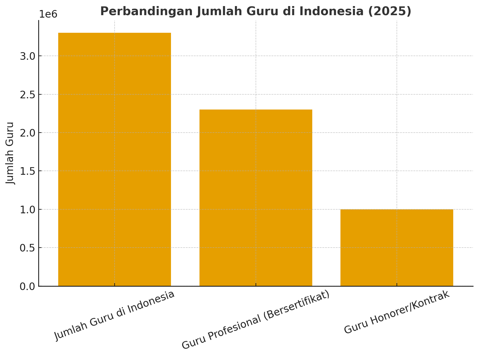 Ini adalah infografis perbandingan jumlah guru di Indonesia tahun 2025. Terlihat bahwa meski jumlah guru profesional (bersertifikat) cukup besar, masih ada sekitar 1 juta guru berstatus honorer atau kontrak dengan kesejahteraan yang jauh dari ideal.