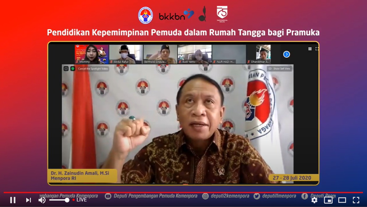 Schoolmedia News, Jakarta - Menteri Pemuda dan Olahraga Republik Indonesia Zainudin Amali secara resmi membuka webinar Pendidikan Kepemimpinan Pemuda dalam Rumah Tangga bagi Pramuka melalui aplikasi Zoom, hari ini. Ia menyebut, gerakan pramuka menjadi sangat penting dan menjadi ujung tombak dari pembangunan karakter.