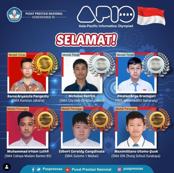 Schoolmedia News, Tangerang Selatan - Pusat Prestasi Nasional Kementerian Pendidikan dan Kebudayaan RI bekerja sama dengan Ikatan Alumni Tim Olimpiade Komputer Indonesia (IA TOKI) sukses menggelar Asia-Pacific Informatics Olympiad (APIO) ke-14 tahun ini. Perhelatan APIO ke-14 bertajuk “Informatics for a Better Education and Life” ini digelar sejak 14-21 Agustus 2020 dan melibatkan 852 siswa SMA dari 33 negara.