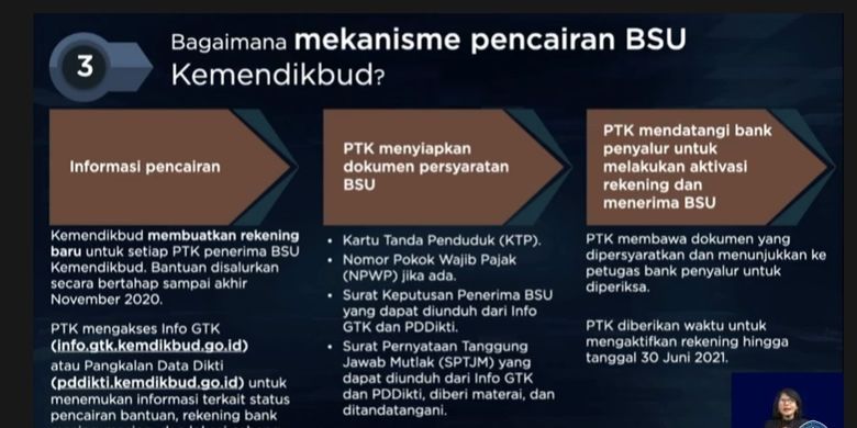 Ketika sudah melengkapi semua dokumen persyaratan, Nadiem melanjutkan, PTK bisa mendatangi langsung bank penyalur BSU dan melakukan aktivasi rekening. Tujuannya, agar mempermudah proses pencairan BSU.