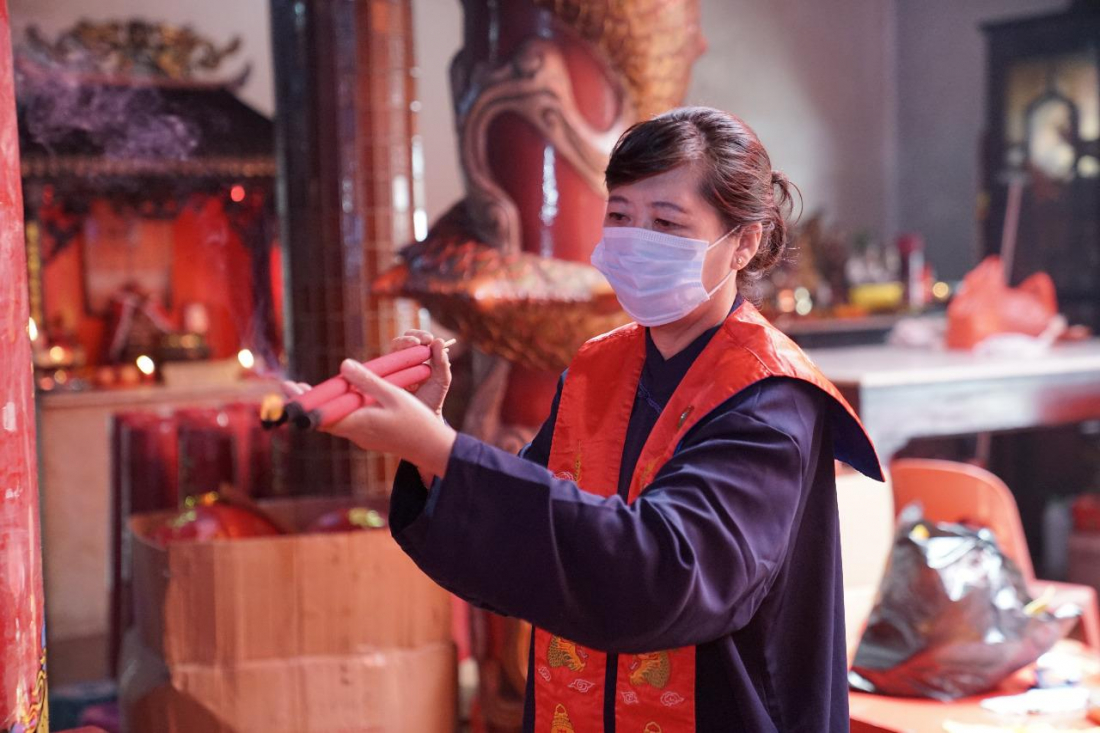 Seorang pengurus klenteng tengah menyalakan hio dengan menggunakan masker guna berdoa menyambut tahun baru Imlek 2021. Foto : Eko Schoolmedia