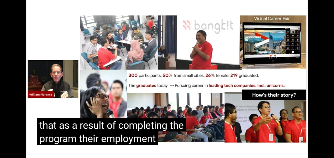 Pada akhirnya, 219 orang dari 300 orang menyelesaikan program, sekitar 73% tingkat kelulusan. Yang mana, dalam situasi pandemi ini cukup luar biasa. Bahkan ini lebih baik secara substansial, 73% ini lebih tinggi dari program-program serupa. Program Bangkit pertama ini diikuti 26% partisipan perempuan, dan dari 300 orang, 50% dari kota kecil.