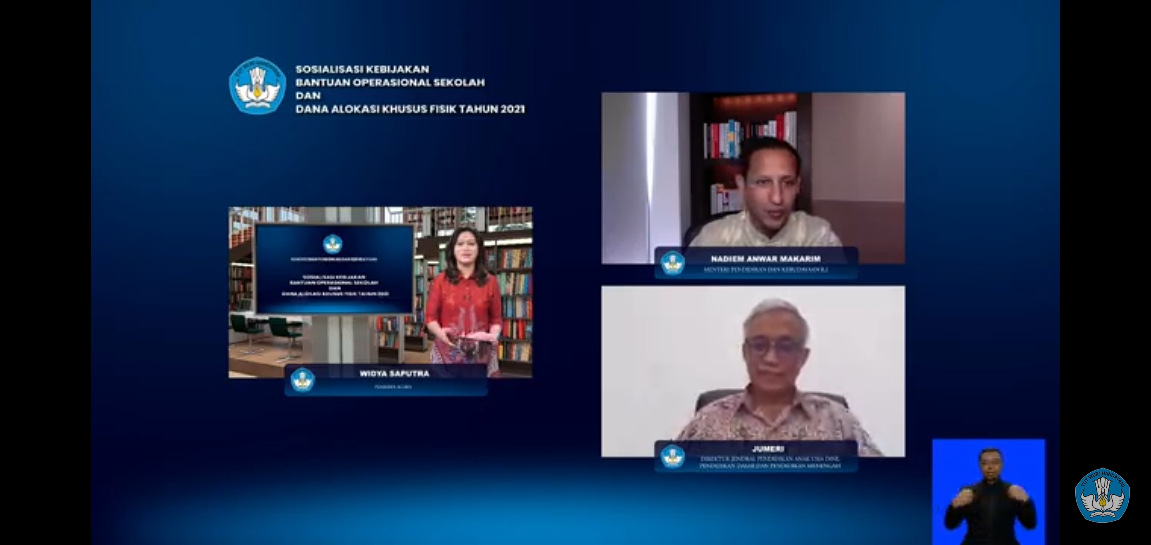 "Prinsip keadilan sosial bagi seluruh bangsa Indonesia seperti tertuang dalam Pancasila menjadi hal utama dalam pengelolaan anggaran kementerian," kata Mendikbud, Nadiem Anwar Makarim dalam sosialisas kebijakan BOS dan Dana Alokasi Khusus (DAK) Fisik Tahun 2021, secara daring, Kamis (25/2).