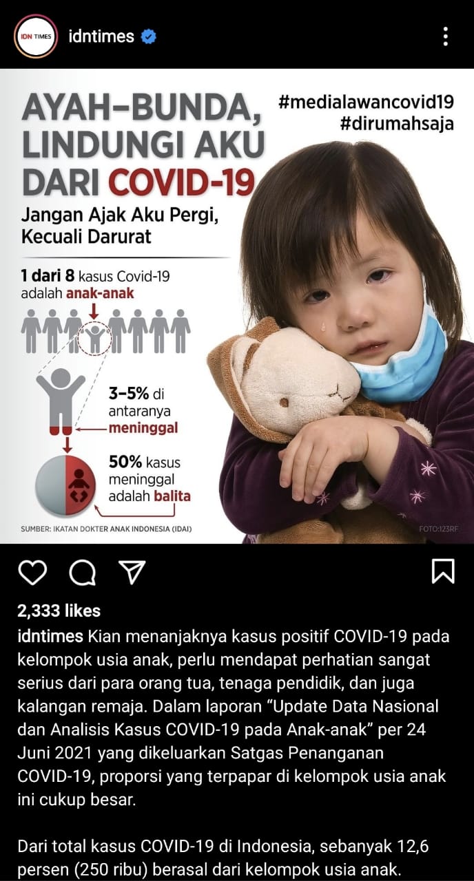 “Langkah ini juga untuk merespons semakin tingginya angka penularan dan kasus COVID-19 kepada anak di Indonesia sehingga harus diambil langkah nyata sebagai bentuk perlindungan negara,” ujarnya, dikutip dari laman resmi Kementerian PPPA, Selasa (29/06/2021).