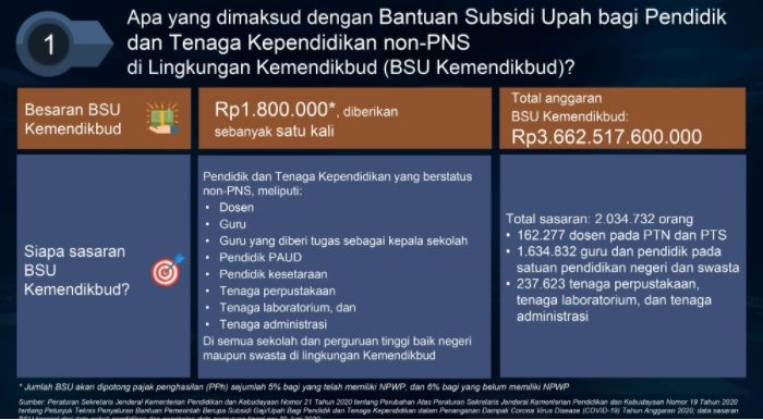 Hal tersebut diatur dalam Peraturan Sekretaris Jenderal Nomor 11 Tahun 2021 tentang Perubahan Kedua Atas Peraturan Sekretaris Jenderal Nomor 19 Tahun 2020 tentang Petunjuk Teknis Penyaluran Bantuan Pemerintah Subsidi Upah Bagi Pendidik dan Tenaga Kependidikan dalam Penanganan Dampak Covid-19.