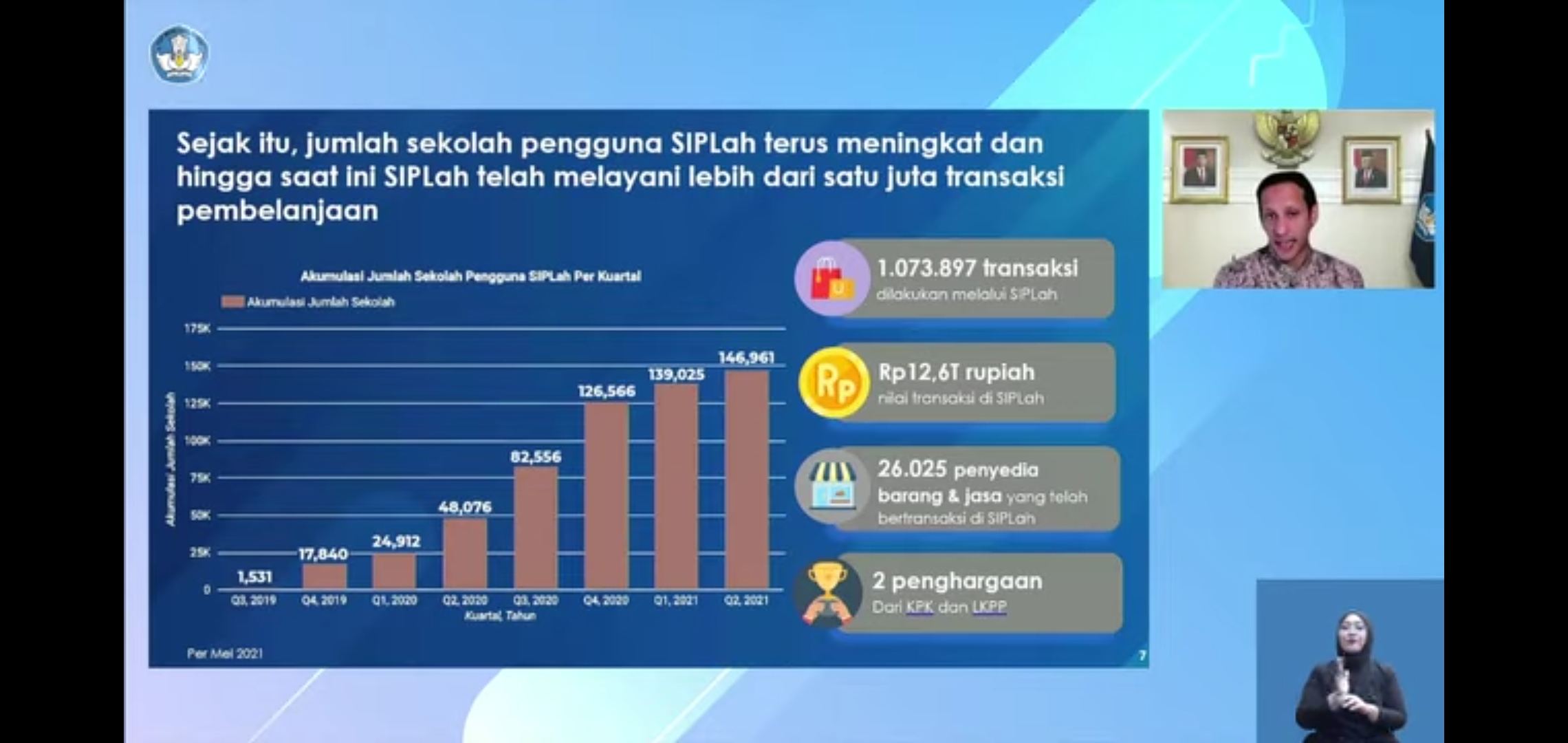 Tercatat, sebanyak 1.073.897 transaksi dilakukan melalui SIPLah, Rp12,6 triliun nilai transaksi di SIPLah, 26.025 penyedia barang dan jasa yang telah bertransaksi di SIPLah, serta capaian Kemendikbudristek meraih dua penghargaan dari Komisi Pemberantasan Korupsi (KPK) dan Lembaga Kebijakan Pengadaan Barang/Jasa Pemerintah (LKPP).