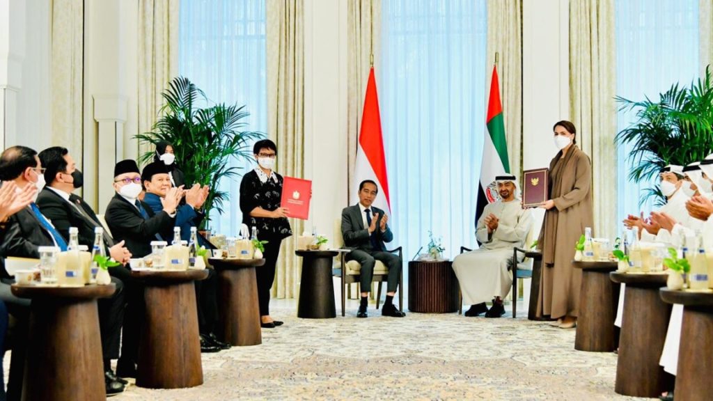 Schoolmedia News Jakarta ----- Presiden RI Joko Widodo (Jokowi) dan Presiden Persatuan Emirat Arab (PEA) Sheikh Mohamed bin Zayed bin Sultan Al Nahyan menyaksikan pertukaran dokumen IUAE-CEPA (Indonesia-United Arab Emirates Comprehensive Economic Partnership Agreement) yang telah disepakati kedua negara, Jumat (01/07/2022), di Istana Al Shatie, Abu Dhabi, PEA.