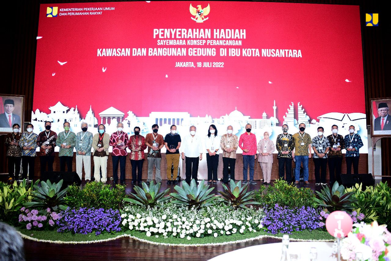 Foto: Menteri Pekerjaan Umum dan Perumahan Rakyat (PUPR) Basuki Hadimuljono bersama Direktur Jenderal Cipta Karya Diana Kusumastuti dan Ketua Umum Ikatan Arsitek Indonesia (IAI) Gregorius Budi Yulianto bersama para pemenang Sayembara Konsep Perancangan Kawasan dan Bangunan Gedung Ibu Kota Negara (IKN) Nusantara di Auditorium kementerian PUPR, Senin (18/7/2022).(Dok. Kementerian PUPR)