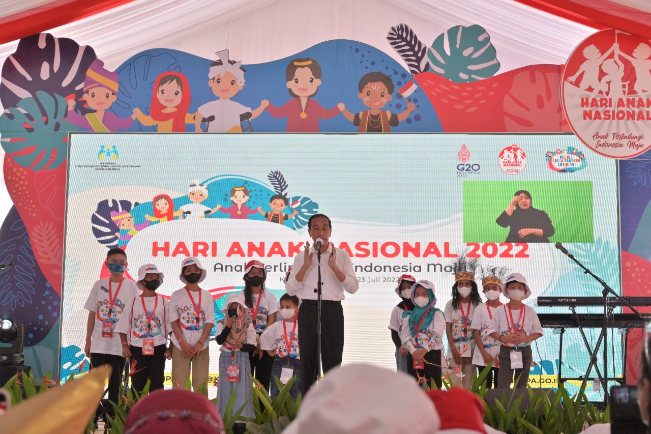 Presiden RI Joko Widodo (Jokowi) menghadiri acara peringatan Hari Anak Nasional yang digelar di Kebun Raya Bogor, Jawa Barat, Sabtu (23/07/2022). Dalam kesempatan tersebut, Presiden mengaku senang dapat bisa berinteraksi dan melihat keceriaan dan keaktifan anak-anak yang menunjukkan kreativitasnya.