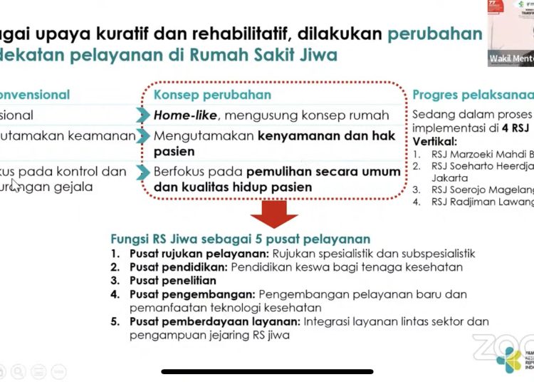 Dikatakan Wamenkes, saat ini implementasi transformasi kesehatan jiwa sedang dilaksanakan di 4 RSJ vertikal diantaranya RSJ Marzoeki Mahdi Bogor, RSJ Soeharto Heeedjan Jakarta, RSJ Soerojo Magelang dan RSJ Radjiman Lawang.