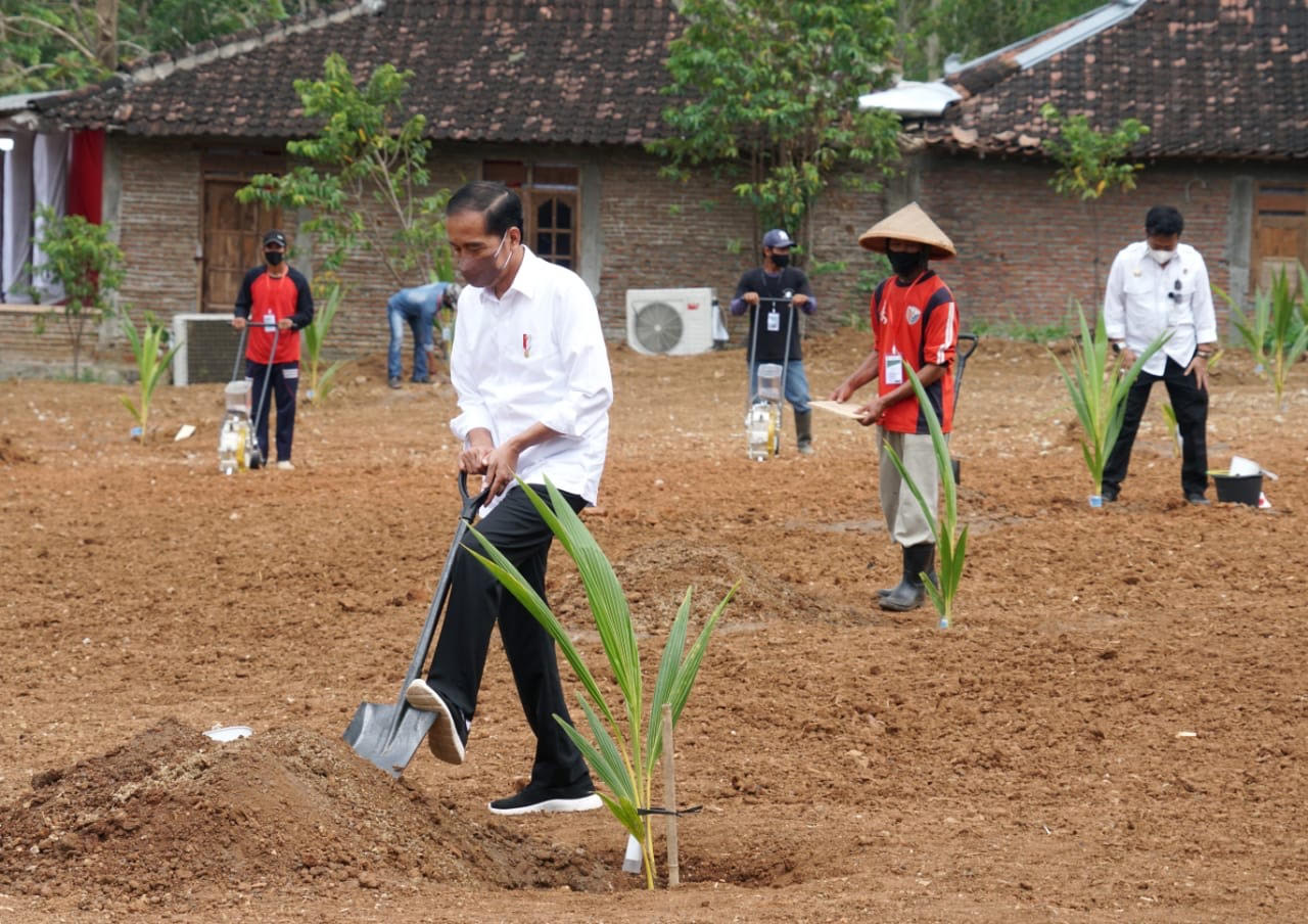 Schoolmedia News Sukoharjo --- Presiden RI Joko Widodo (Jokowi) didampingi Ibu Iriana Jokowi melakukan kegiatan peninjauan dan penanaman kelapa genjah bersama para petani di Dukuh Samin, Desa Sanggang, Kecamatan Bulu, Kabupaten Sukoharjo.