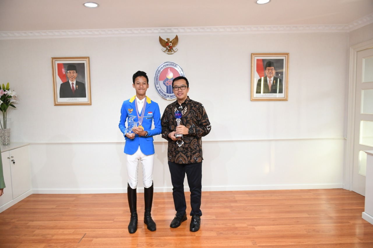Menpora Imam Nahrawi mengapresiasi atlet berkuda Muhammad Akbar Kurniawan (15) atau Aan atas prestasinya menjadi Juara Dunia Berkuda Junior di seri kejuaraan dunia Longines Master-HKJC Asian Junior Challenge 2019. Imam Nahrawi memberikan apresiasi tersebut kepada Aan dan orang tuanya Fatchul Anas, di ruang rapat lantai 10, Kemenpora Kemenpora, Senin (20/5) sore. Penyerahan apresiasi tersebut juga disaksikan oleh Ketua Pordasi DKI Jakarta Alex Asma Subrata dan pengurus lainnya.