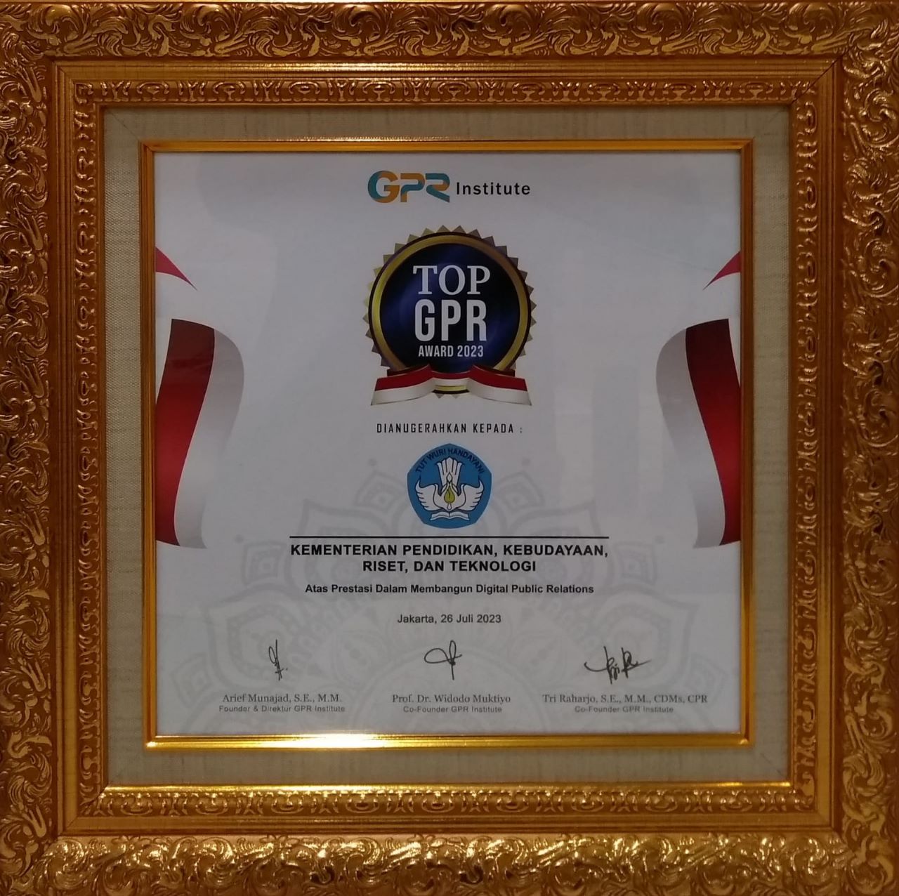 Schoolmedia News Jakarta ----- penghargaan dari Government Public Relations (GPR) Institute dalam TOP GPR Award & GPR Leader Award 2023. Kemendikbudristek memperoleh penghargaan dari TOP GPR Award 2023 dengan skor final 89,12 poin atas ‘Prestasi dalam Membangun Digital Public Relations’.