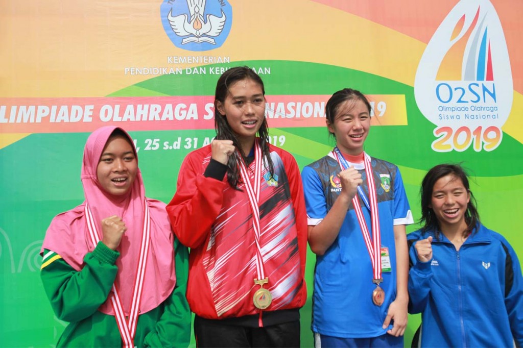 SCHOOLMEDIA NEWS, Banda Aceh - Perenang asal SMAN 1 Kuta Utara, Intan Putri Adhika Fenadi dari Provinsi Bali akhirnya mampu menyentuh garis finis terlebih dahulu di babak final cabor renang nomor 100 meter puteri pada Olimpiade Olaharaga Siswa Nasional (O2SN) jenjang SMA. Pertarungan itu terjadi di kolam renang Batalyon Raider 112/Dharma Jaya, Aceh, pada Rabu (28/8).