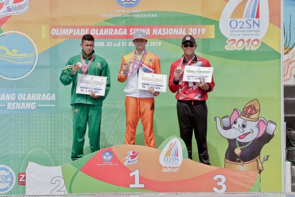 SCHOOLMEDIA NEWS, Aceh - Lanang Garudana Putra Farlen M, kontingen dari Provinsi Jawa Tengah berhasil mencatatkan waktunya lebih cepat dari delapan finalis di babak semifinal Olimpiade Olahraga Siswa Nasional (O2SN) tingkat SMA 2019. Siswa SMAN 2 Semarang ini mencapai garis finis dengan waktu 00.55.27 di cabang olahraga (cabor) renang 100 meter gaya bebas putra. Kompetisi perebutan gelar juara itu berlangsung di kolam renang Batalyon Raider 112/Dharma Jaya, Aceh, pada Rabu (28/8).