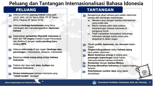 Fokus kebijakan ketiga berkaitan dengan internasionalisasi bahasa Indonesia. Internasionalisasi bahasa Indonesia merupakan upaya meningkatkan fungsi bahasa Indonesia menjadi bahasa internasional berdasarkan amanat Undang-Undang Nomor 24 Tahun 2009 tentang Bendera, Bahasa, dan Lambang Negara, serta Lagu Kebangsaan. Untuk mewujudkan bahasa Indonesia sebagai bahasa internasional, strategi Lingua Franca Plus ditempuh melalui peningkatan penyebaran bahasa Indonesia di berbagai ranah penggunaan dengan menggunakan pendekatan pendidikan, kebudayaan, pariwisata, olahraga, ekonomi, investasi, politik, diplomasi, pertahanan, dan keamanan.