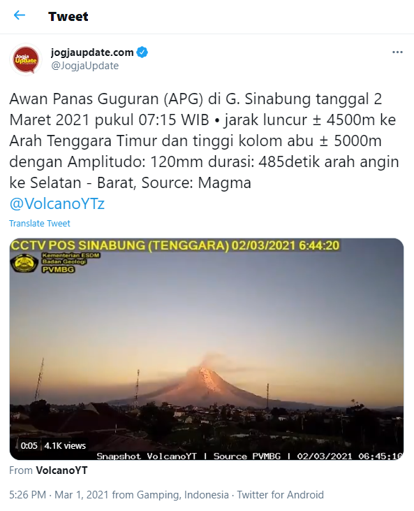 Informasi ini disampaikan langsung melalui cuitan twitter @id_magma yang menginformasikan bahwa Gunung Sinabung mengeluarkan guguran awan panas dengan jarak luncur 3.000 meter kea rah timur tenggara pada Selasa (2/3) pukul 07.11 WIB.